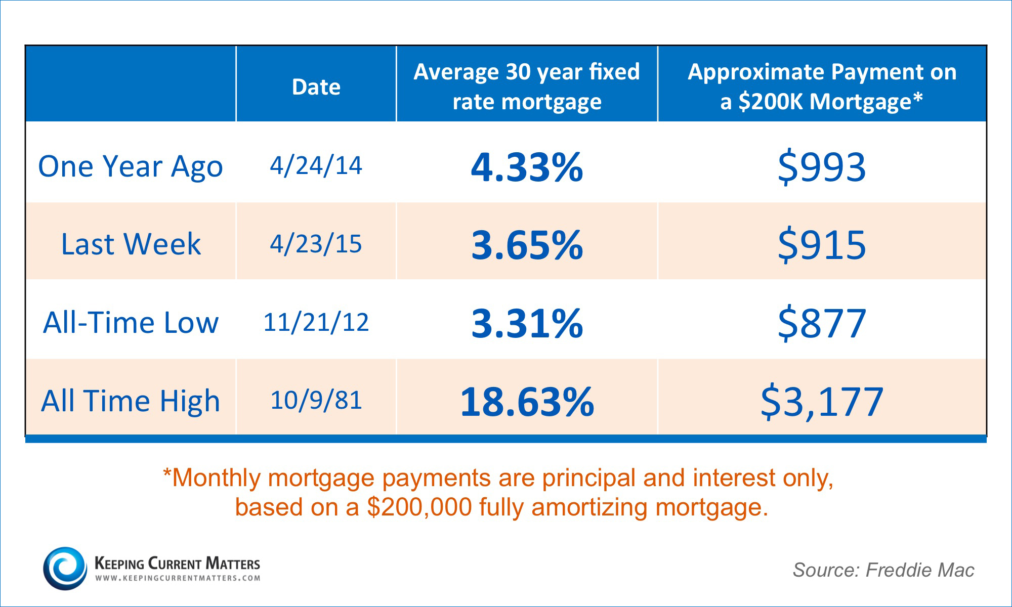 The article went on to calculate what the principal and interest payment would be based on a $200,000 fully amortizing mortgage at different times in history.