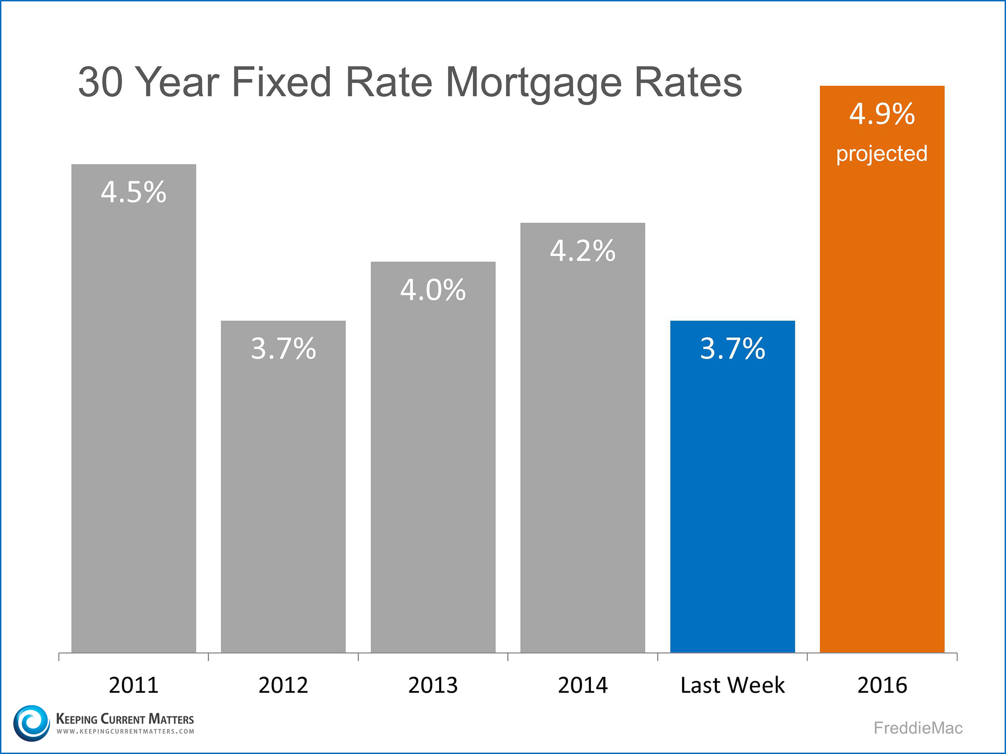 “Over the past few years, we’ve enjoyed a long run of historically low mortgage rates. While no one expects them to change dramatically overnight, they are expected to head up. Most experts agree that mortgage rates will drift up in the coming months to end the year approaching 4.50%… Buying a home is a big investment – perhaps the biggest one you’ll make in your life. So, it’s important to be sure you are ready to make that purchase. If you are ready, today’s rates are not to be missed.”